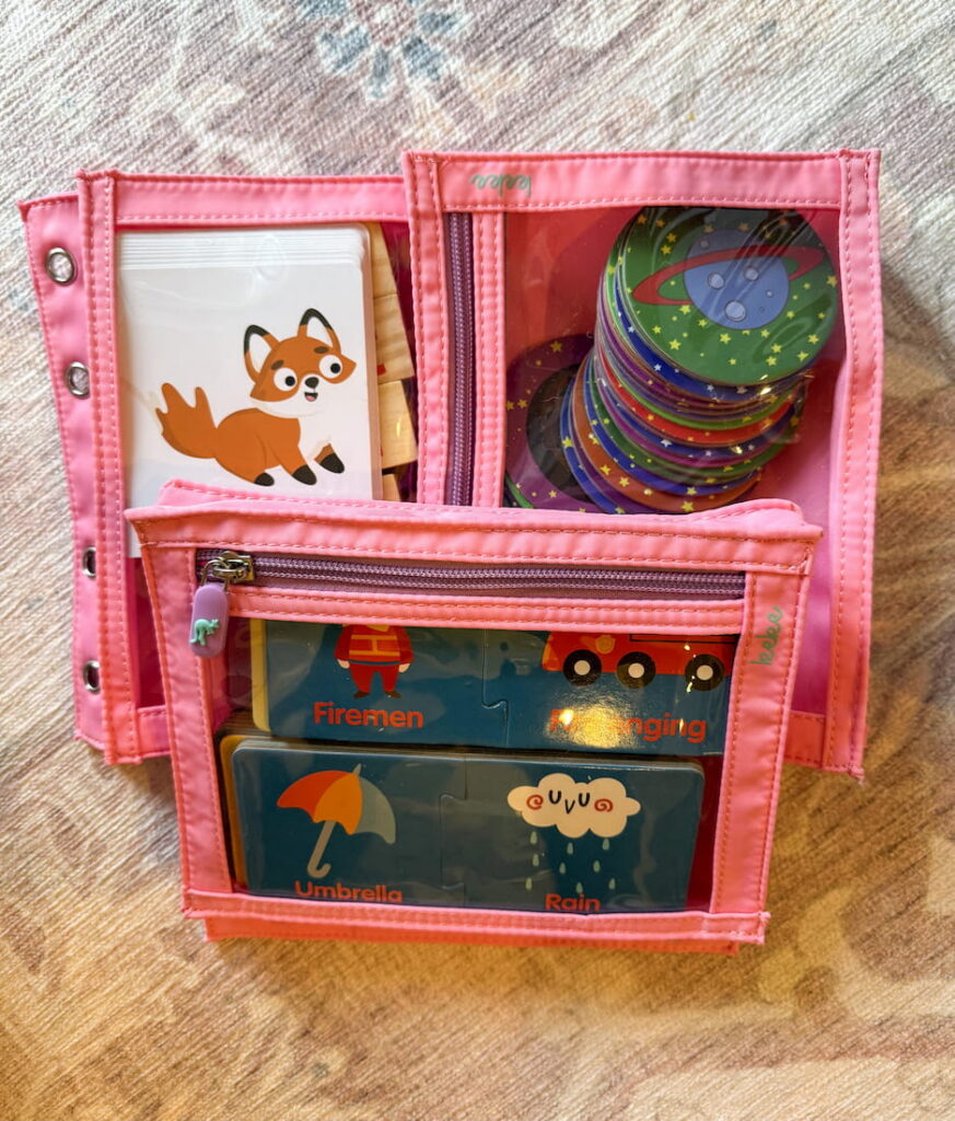 12. KeKe bag. This is such a cute concept and useful for both travel and local entertainment. You choose a color for the case, and the inside is much like a binder. Four individual zipped toys come with the kit. You can sign up for a subscription service that is delivered on a quarterly basis with new toys to trade into the purse. For local travel, it makes more sense to bring the purse or carrying bag. When traveling with your kids on an airplane, I enjoy bringing just the individual zip pouches. Their recommended age range is 3-6 years. My daughter enjoys the majority of the games even at 2 years of age. She is not able to use all of them to their full capabilities, but I still found this to be worthwhile addition for travel play. This is something that will grow with your child.