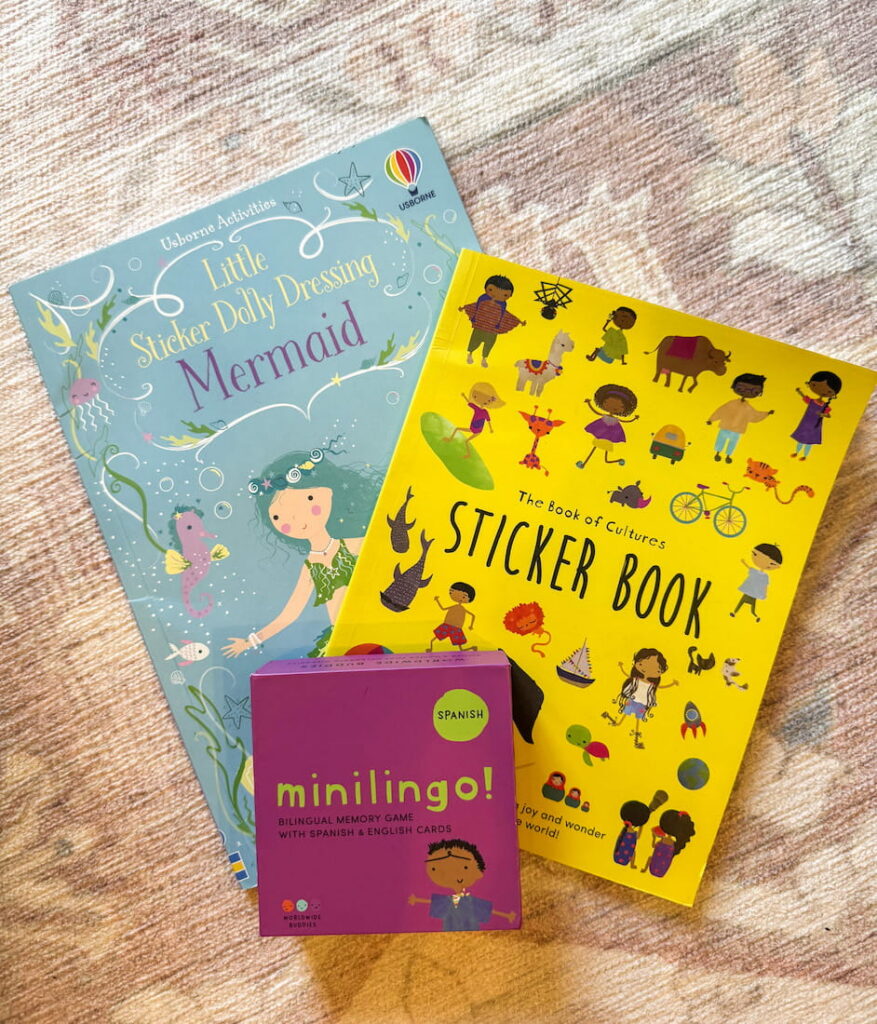 3. Sticker books. Sticker books are something that have become a lot more popular with my daughter. She started to really enjoy them a few months prior to turning two. This interest has continued throughout all of year two. I always try to bring at least one in our carry on. Here are some great options. This sticker book by Cupkin comes in two sizes. One is rather large, but the vertical option is slightly smaller. I always take a large Cotopaxi backpack and it easily fits inside. This is another option that proved to be entertaining. Finally, click here to view some of the Usbourne Activities options. This is a great brand for activity and sticker books as well. They have tons of different themes and sizes.
